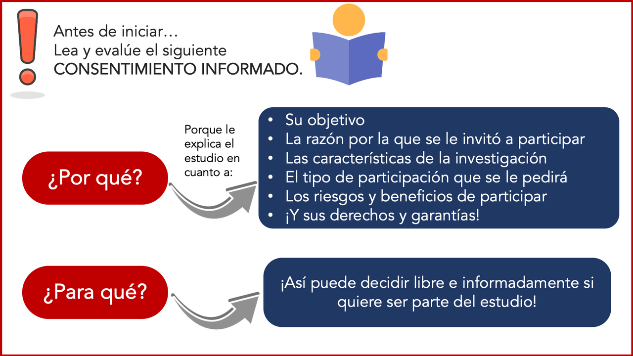 El presente formulario de Consentimiento Informado le permitirá evaluar, juzgar y decidir si desea libre y voluntariamente participar en este estudio. Lea esta página informativa con atención. Puede que existan algunas palabras o conceptos que no entienda. Si eso ocurre, por favor, siéntase en confianza de solicitar que le sean explicados de mejor manera los conceptos. Si tiene preguntas más tarde, puede preguntarle al Investigador Responsable cuando desee a su correo electrónico (cperezv@udec.cl).