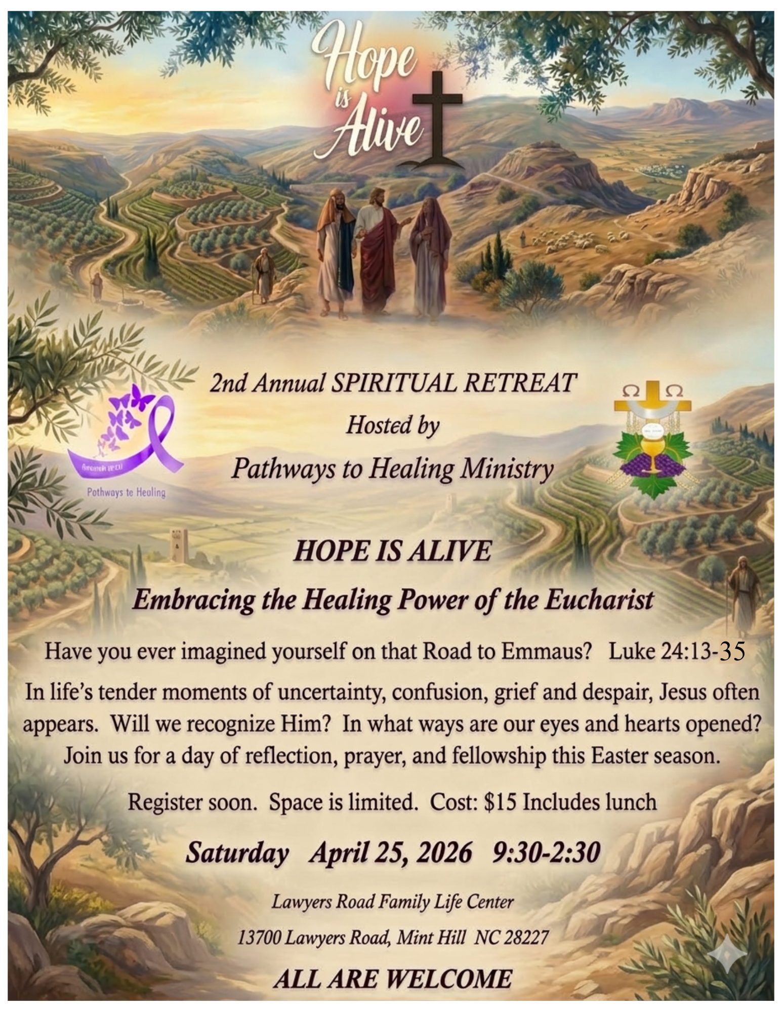 This retreat is sponsored by Pathways to Healing, a support ministry for victims of domestic violence. If you have questions, please email PathwaystoHealing@stlukecatholicminthill.org.