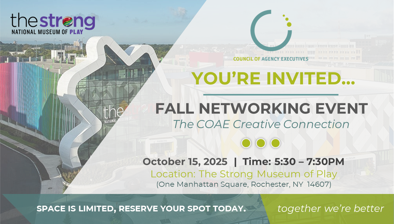 This year's COAE’s Fall Networking Event will be held at The Strong Museum of Play on Wednesday, October 15th. Don’t miss out on this opportunity to welcome the beginning of Fall and unwind at the end of a long workday while socializing with colleagues in a fun and creative atmosphere.