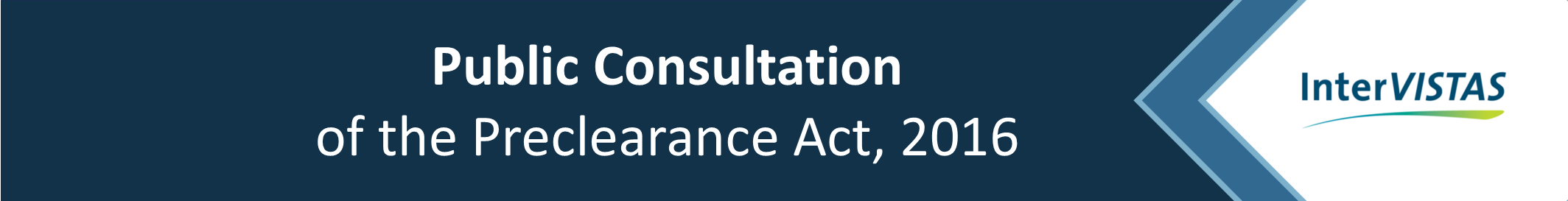 Au nom de Sécurité publique Canada, InterVISTAS recueille les renseignements contenus dans ce sondage afin d’appuyer l’examen indépendant de la Loi sur le précontrôle (2016). Veuillez noter que la participation à ce sondage est entièrement volontaire. Si vous choisissez d’y participer, sachez que les renseignements que vous inscrivez dans une zone de texte pourraient permettre l’identification de personnes, selon les informations fournies. Pour protéger votre vie privée et celle des autres, veuillez-vous abstenir d’inclure des renseignements personnels dans vos réponses (p. ex. noms, adresses, numéros de téléphone, adresses courriel, renseignements financiers, opinions personnelles ou toute autre information permettant de vous identifier). Vos renseignements sont protégés en vertu de la Loi sur la protection des renseignements personnels, et les renseignements personnels que vous fournissez dans ce formulaire sont recueillis conformément au fichier de renseignements personnels POU938.