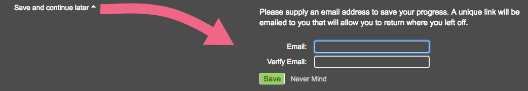 After you begin, you may save your progress and return to your application at any time using the “Save and continue later” option.