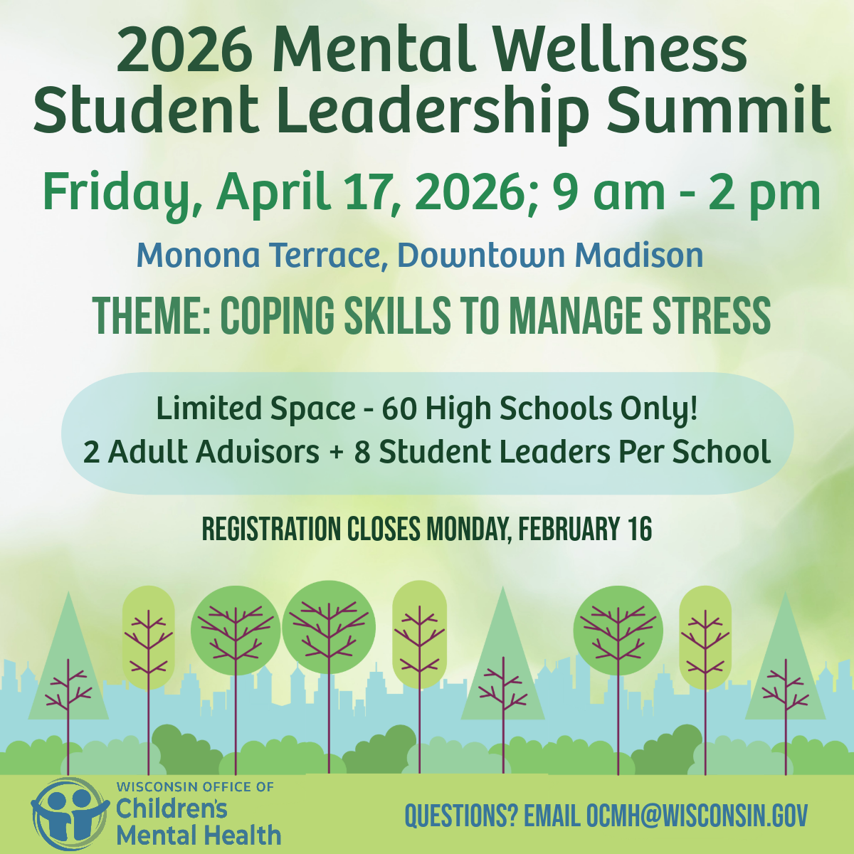 Please join the Wisconsin Office of Children's Mental Health (OCMH) and student leaders from across the state at the 2026 Mental Wellness Student Leadership Summit. This in-person event is for Wisconsin high school students and their program advisors who participate/lead their school's wellness programs. These programs include (but are not limited to) Sources of Strength, REDgen, NAMI Raise Your Voice Club, or Hope Squad. Schools will be limited to bringing no more than 2 program advisors and 8 student attendees