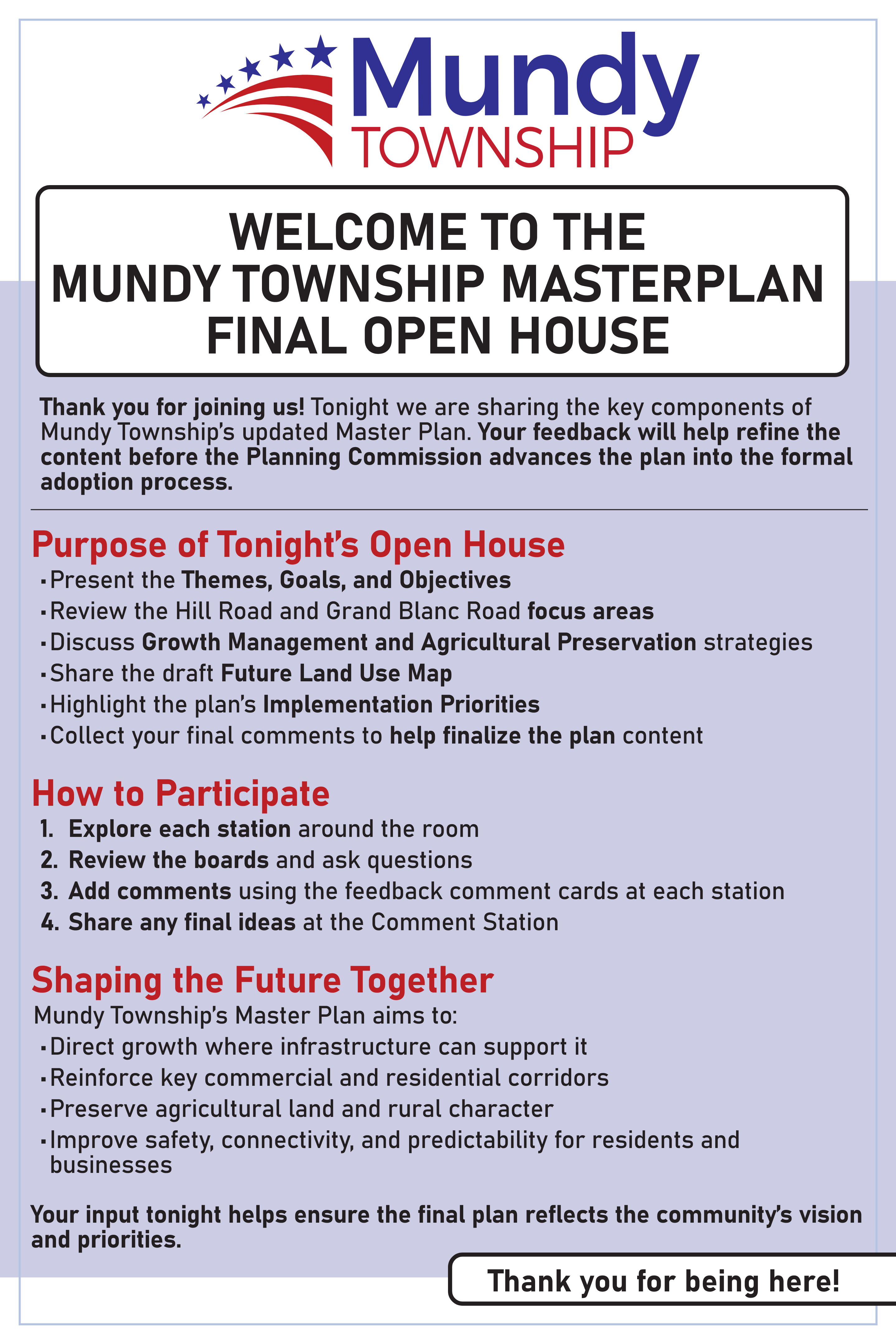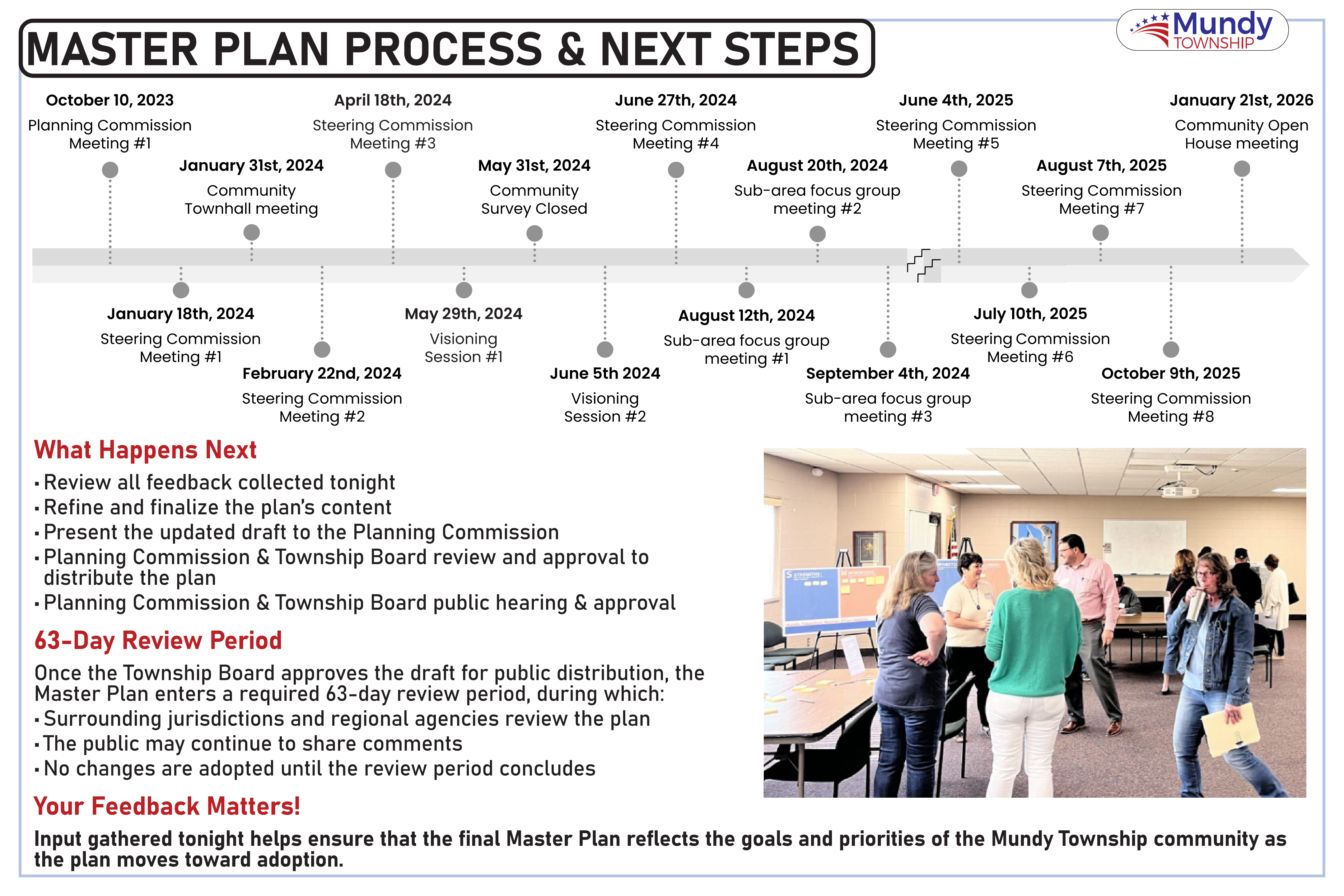 A Community Open House took place on Wednesday, January 22nd at the Township Hall to share and gather feedback on the New Master Plan. While we're grateful for those able to attend the event, we also want to make these materials available for those who were unable to join us. The following five (5) minute survey includes the Open House materials - please review and provide your thoughts and feedback on these matters. We appreciate your insights as it helps us inform priorities on planning for the future of Mundy Township!